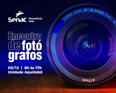 O Senac Aquidabã promove, no dia 3 de dezembro, das 8h às 17h, o Encontro de Fotógrafos, um evento gratuito destinado a profissionais, estudantes e apaixonados por fotografia.