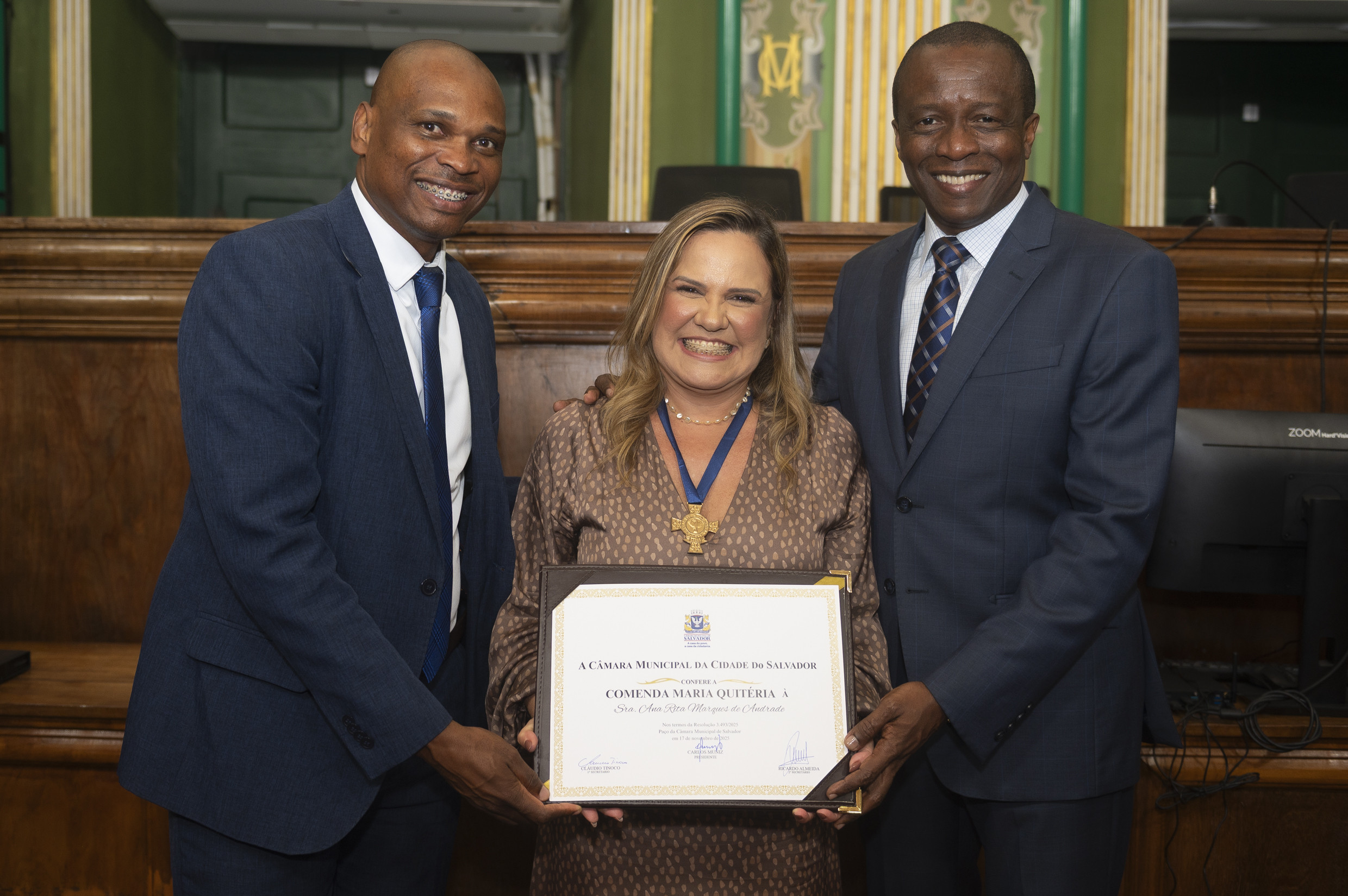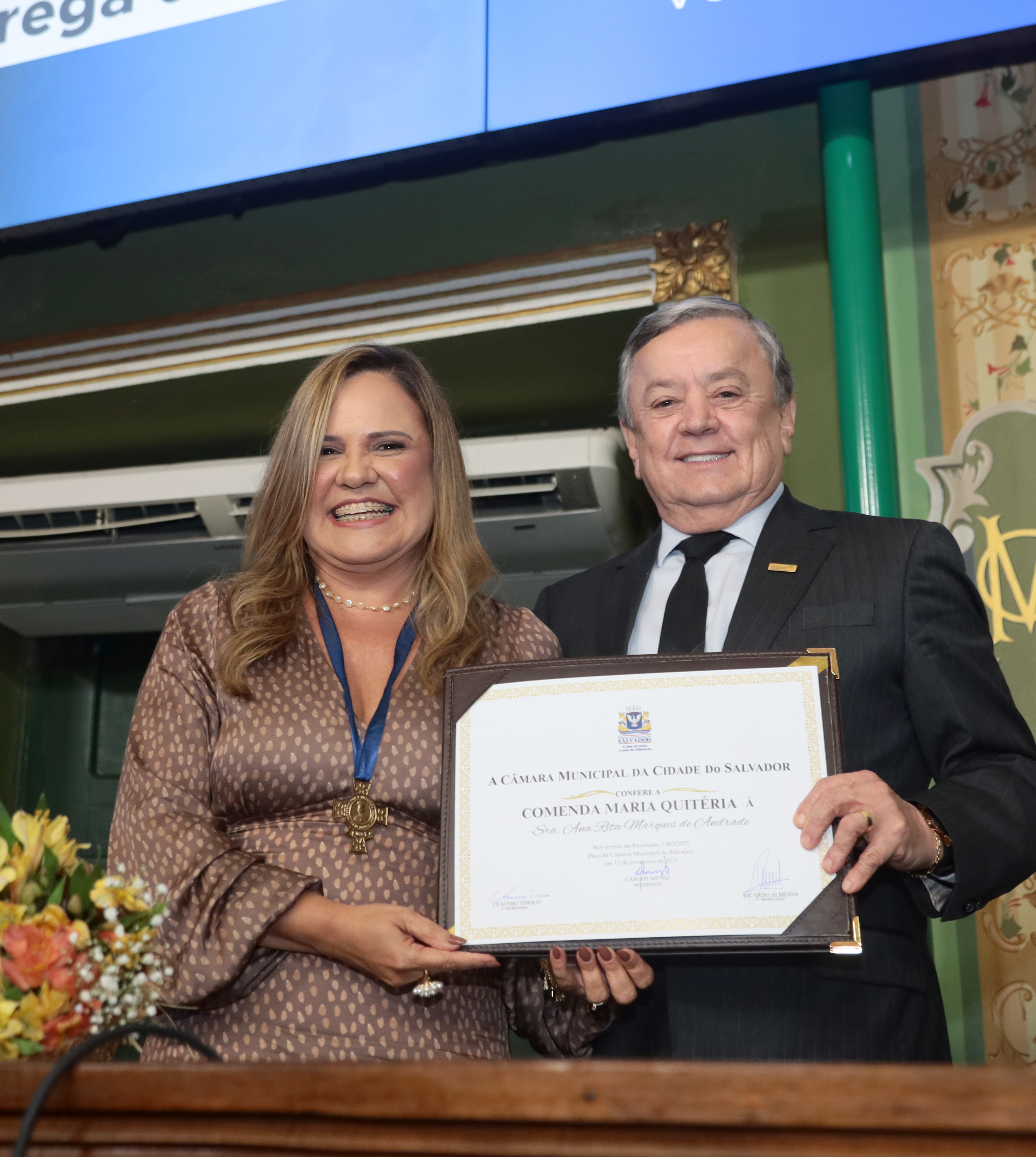 A Câmara Municipal de Salvador realizou, na segunda-feira (17), às 19h, no Plenário Cosme de Farias, a sessão solene de outorga da Comenda Maria Quitéria para a diretora do Senac na Bahia, Ana Rita de Marques Andrade. A homenagem foi requerida pelo vereador Júlio Santos (Republicanos), que presidiu a sessão.